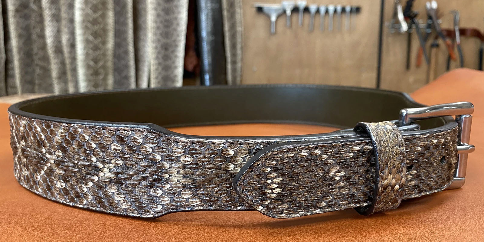WESTERN BELT WITH GENUINE DIAMONDBACK RATTLESNAKE LEATHER This beautiful genuine Western Diamondback Rattlesnake ladies belt is individually hand made from snakeskin backed with single ply 10-12 oz full-grain vegetable tanned leather....