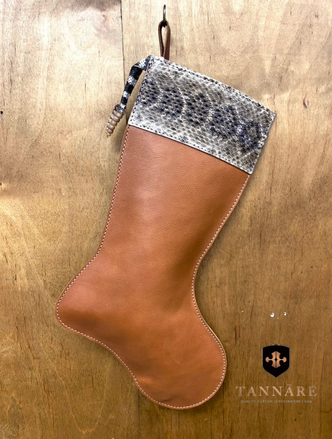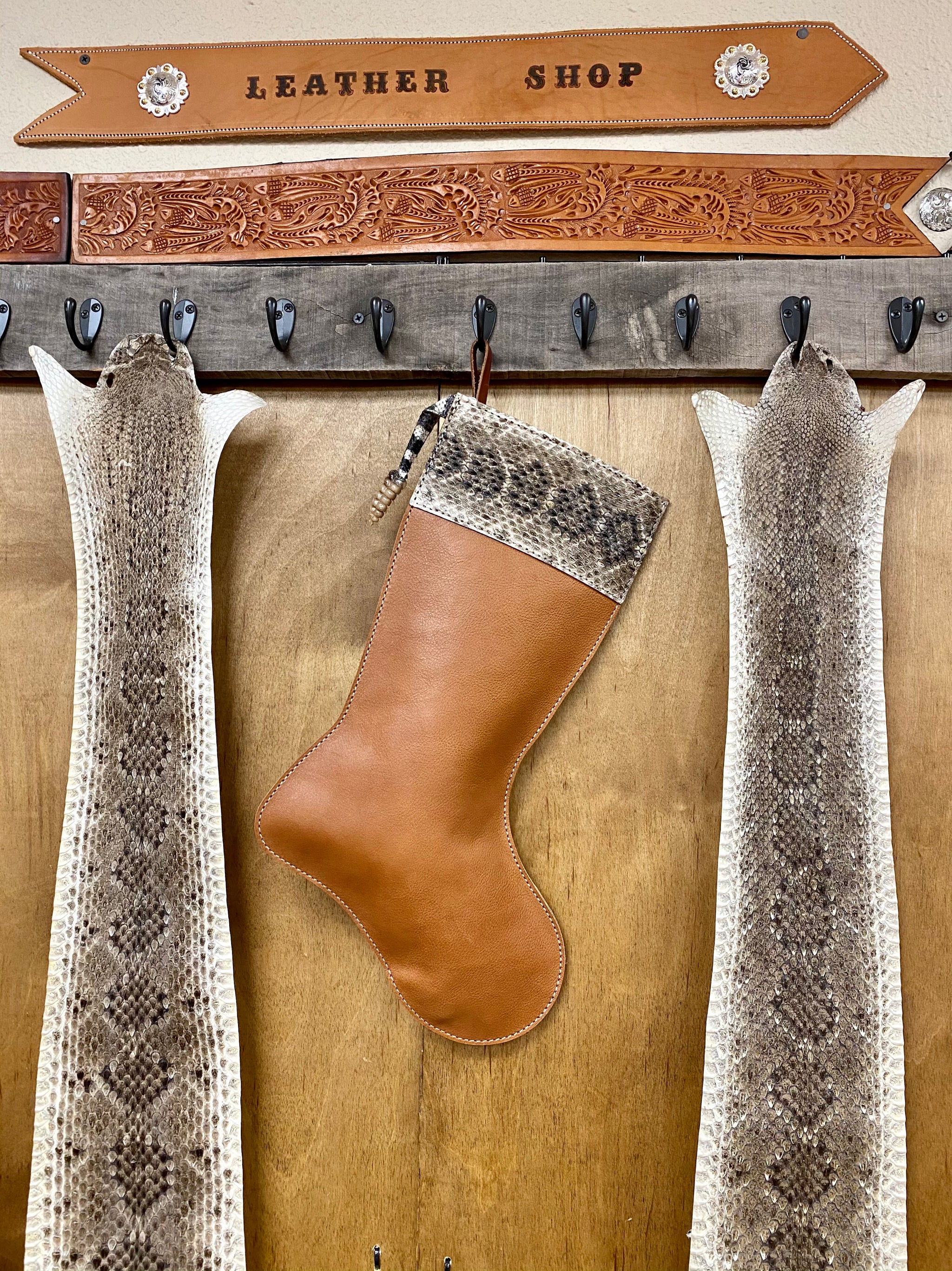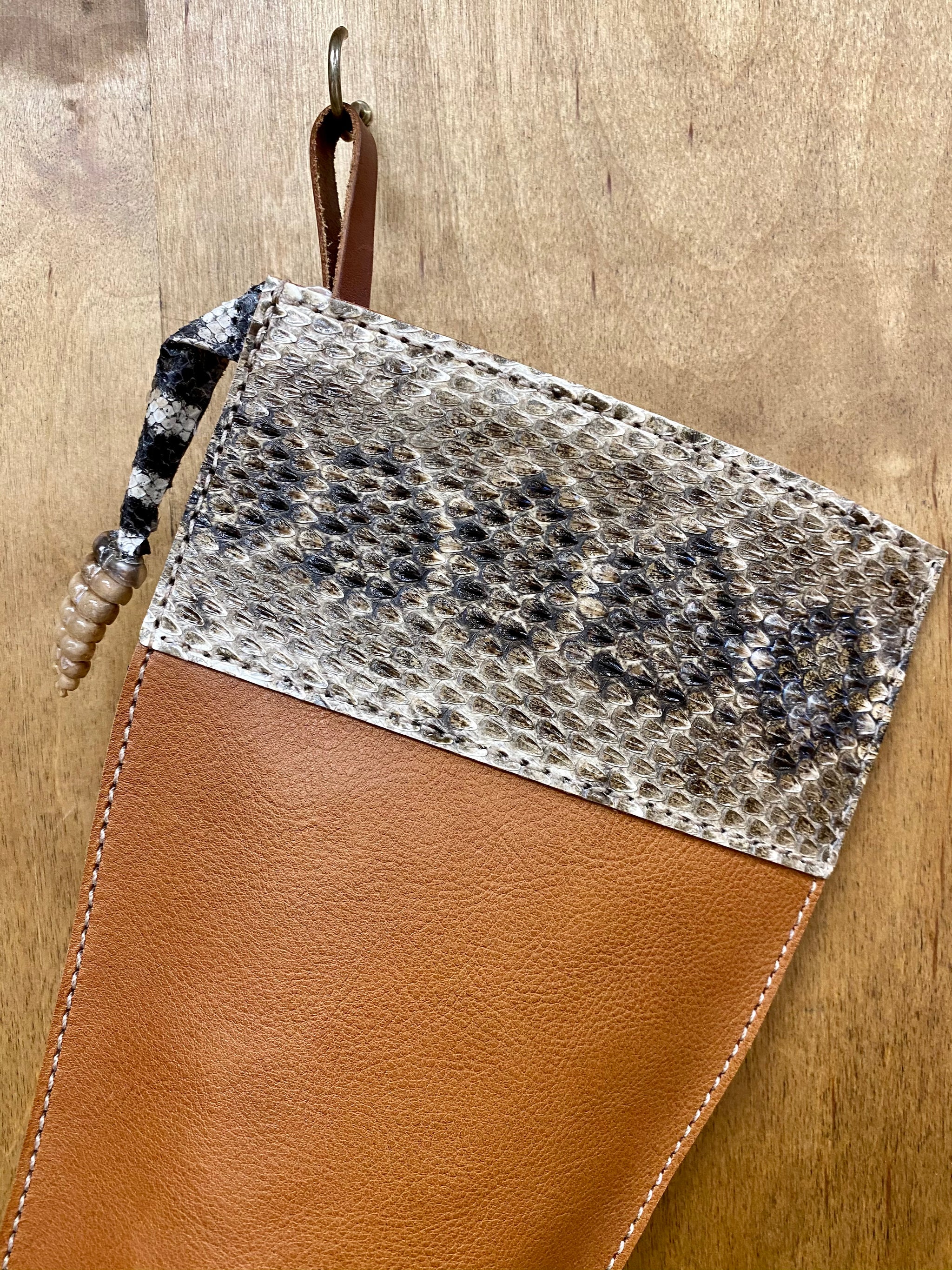 Elevate your mantle with a piece of the Southwest. This unique leather Christmas stocking is masterfully handcrafted in San Antonio, Texas, featuring a dramatic panel of genuine rattlesnake skin set into rich, full-grain leather. It's the perfect statement piece for a rustic, Western, or Texas-themed holiday. Authentic Western Craftsmanship: Handmade from start to finish by Tannare artisans in San Antonio, TX. We use traditional techniques to ensure a luxury finish that lasts for generations.